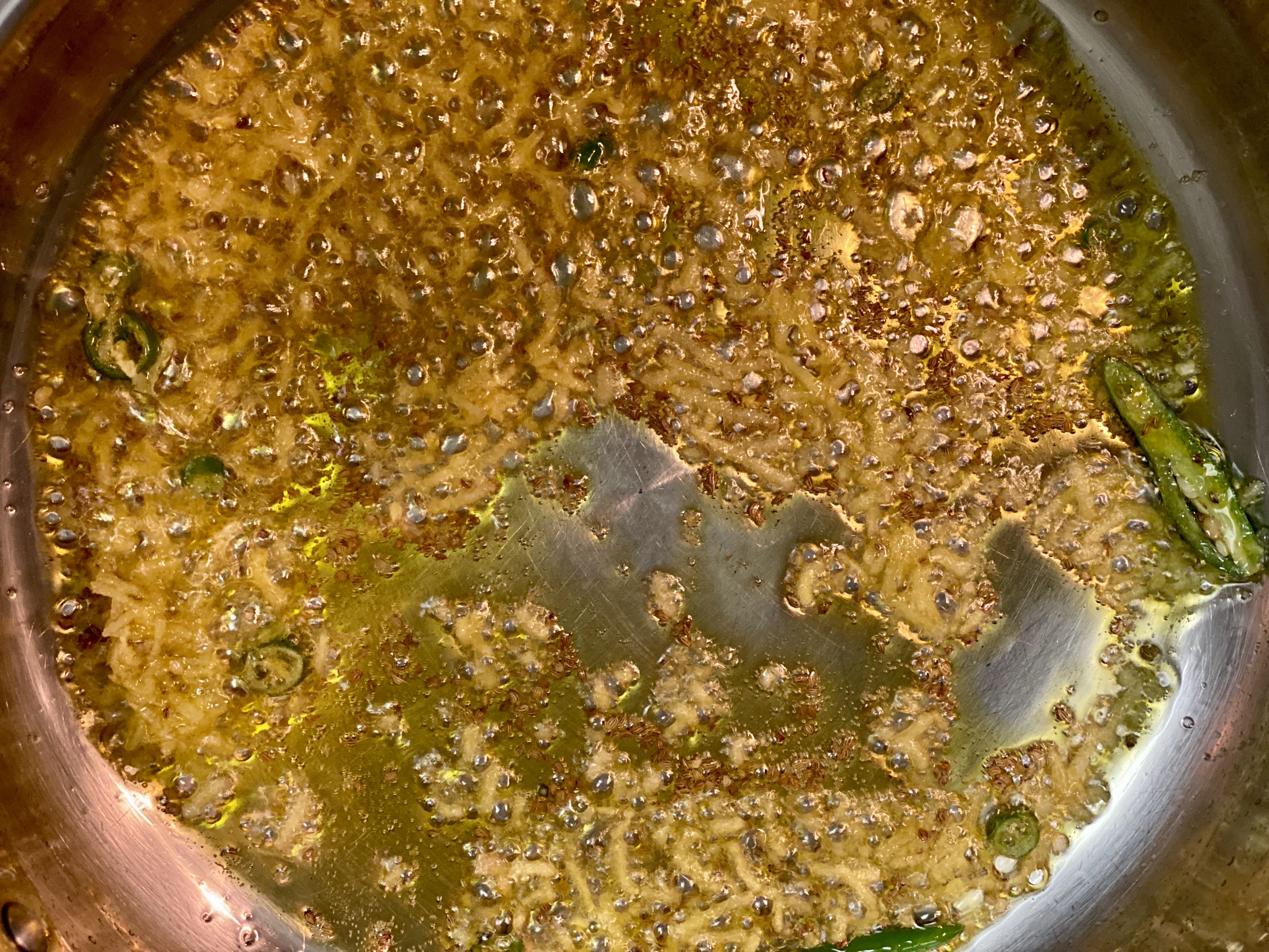 Step5: Heat a heavy bottom pan on low-medium flame. Add mustard oil to the pan. When sufficiently hot add carom seeds, let the seeds sizzle. Then add asafoetida, green chilies finely chopped or slits and grated ginger and saute for 30 sec.