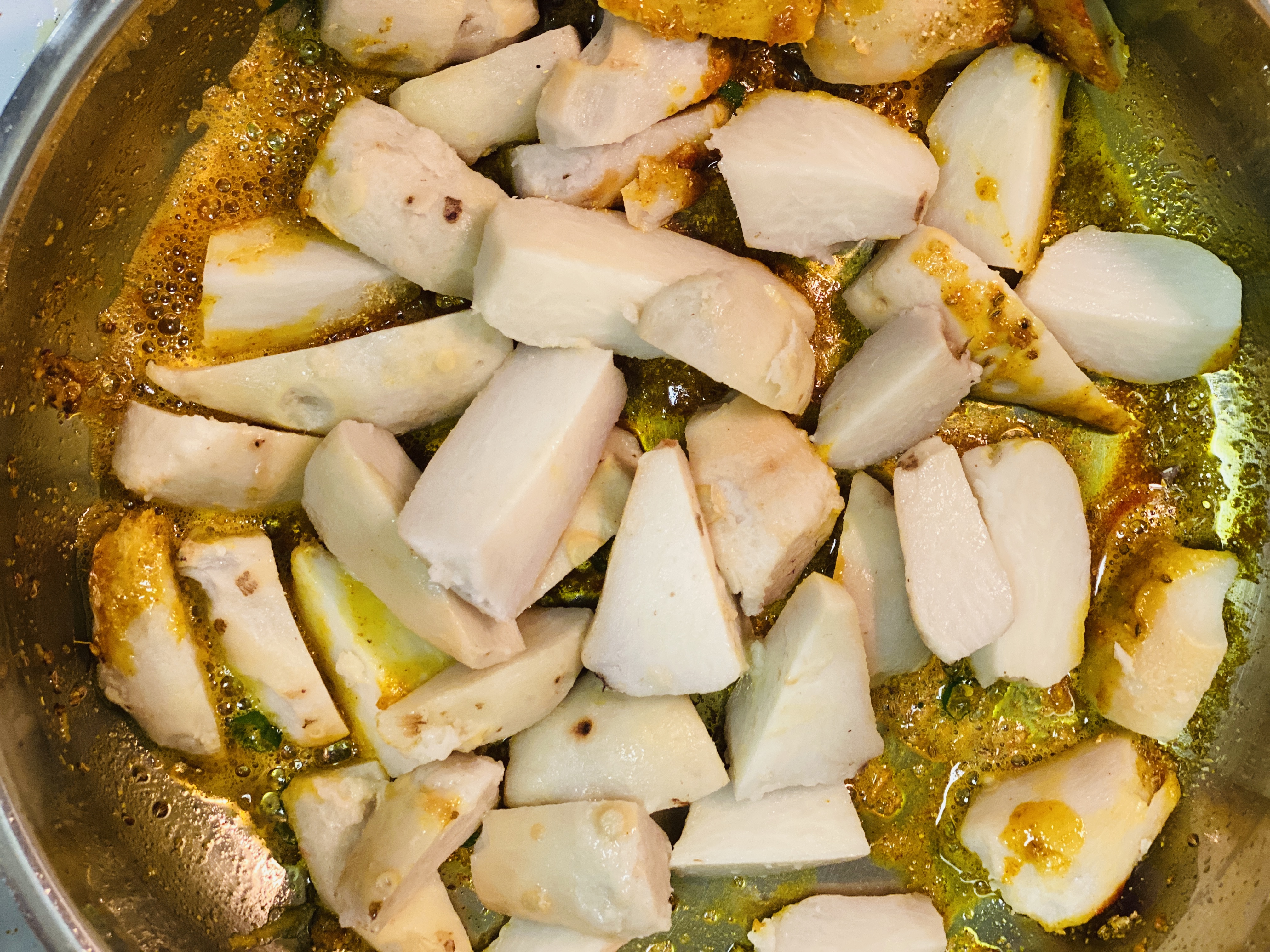 - If you want you may pan-fry them separately until it becomes crispy, then saute with all the spices.