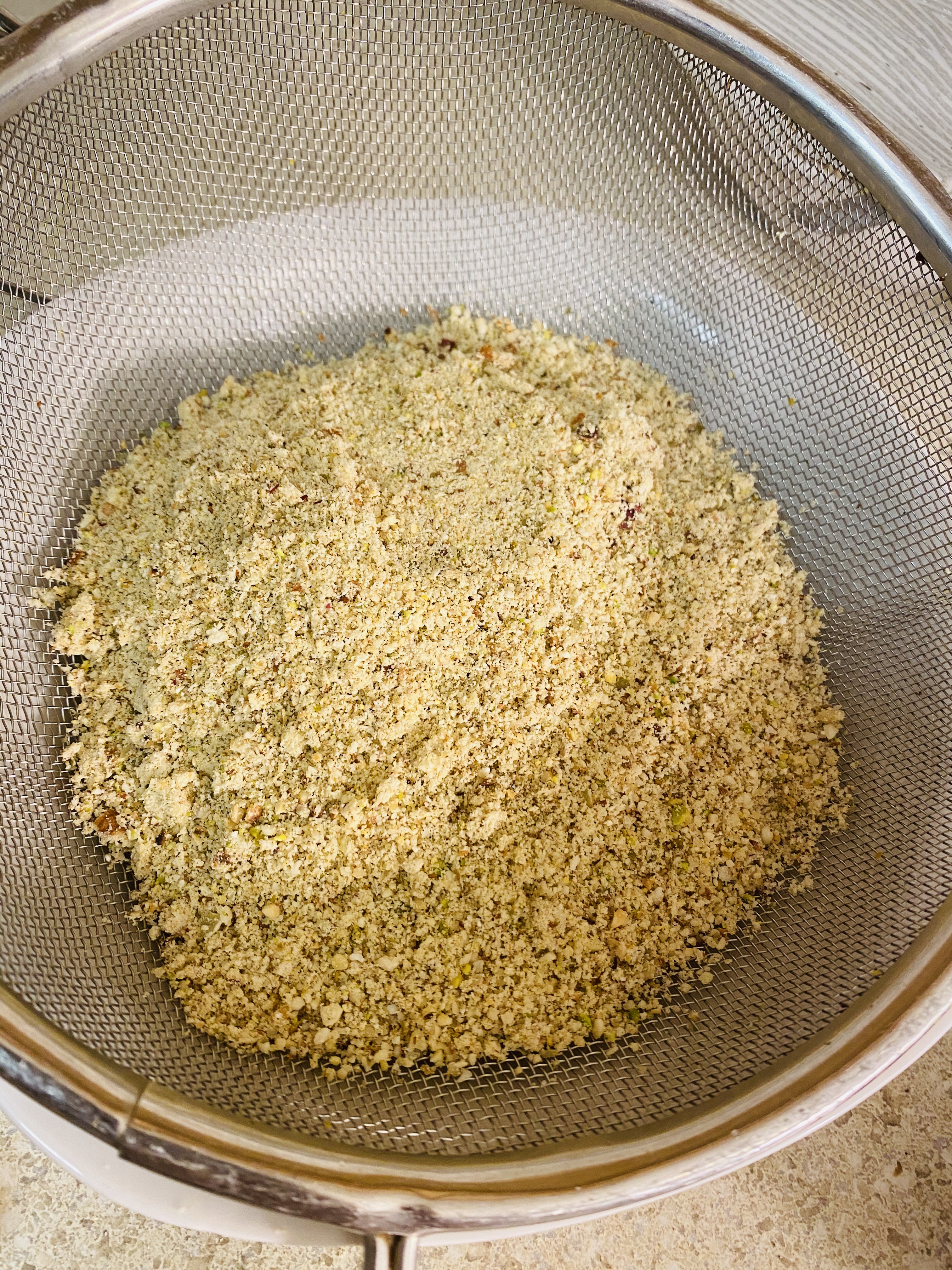 Step6: Repeat with the remaining roasted nuts. It will not be a very fine powder but a slightly coarse one. Now sieve the powder using a sieve. Set the sieved fine powder aside. Collect the hard particles and add it to the blender.