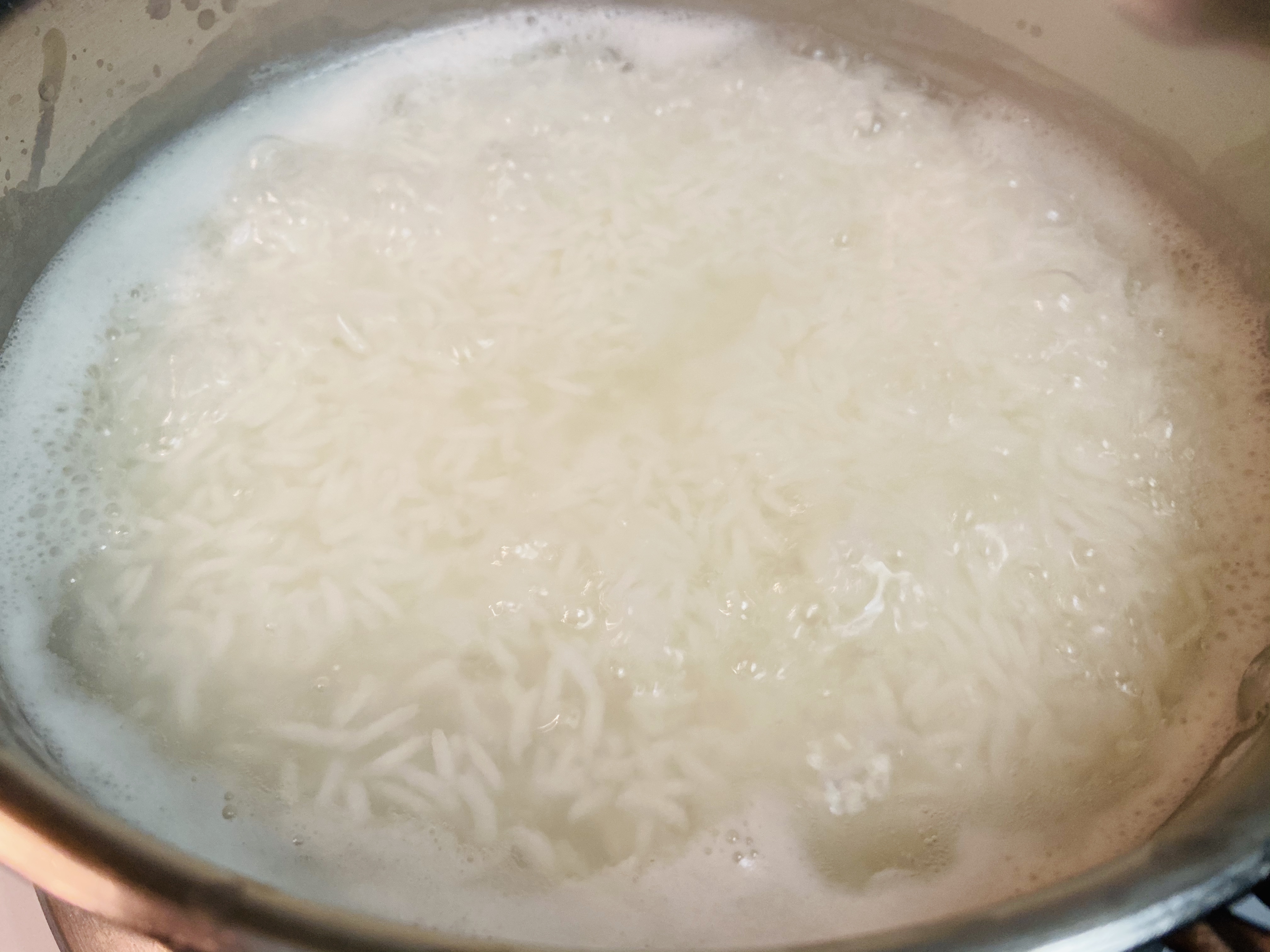 Step2: Bring 3-4 cups of water to a boil in a large pan along with 1 teaspoon salt. Add rice and cook on the medium flame as we normally prepare rice. We have to cook this rice till its 90% done (it takes around 7-8 minutes).