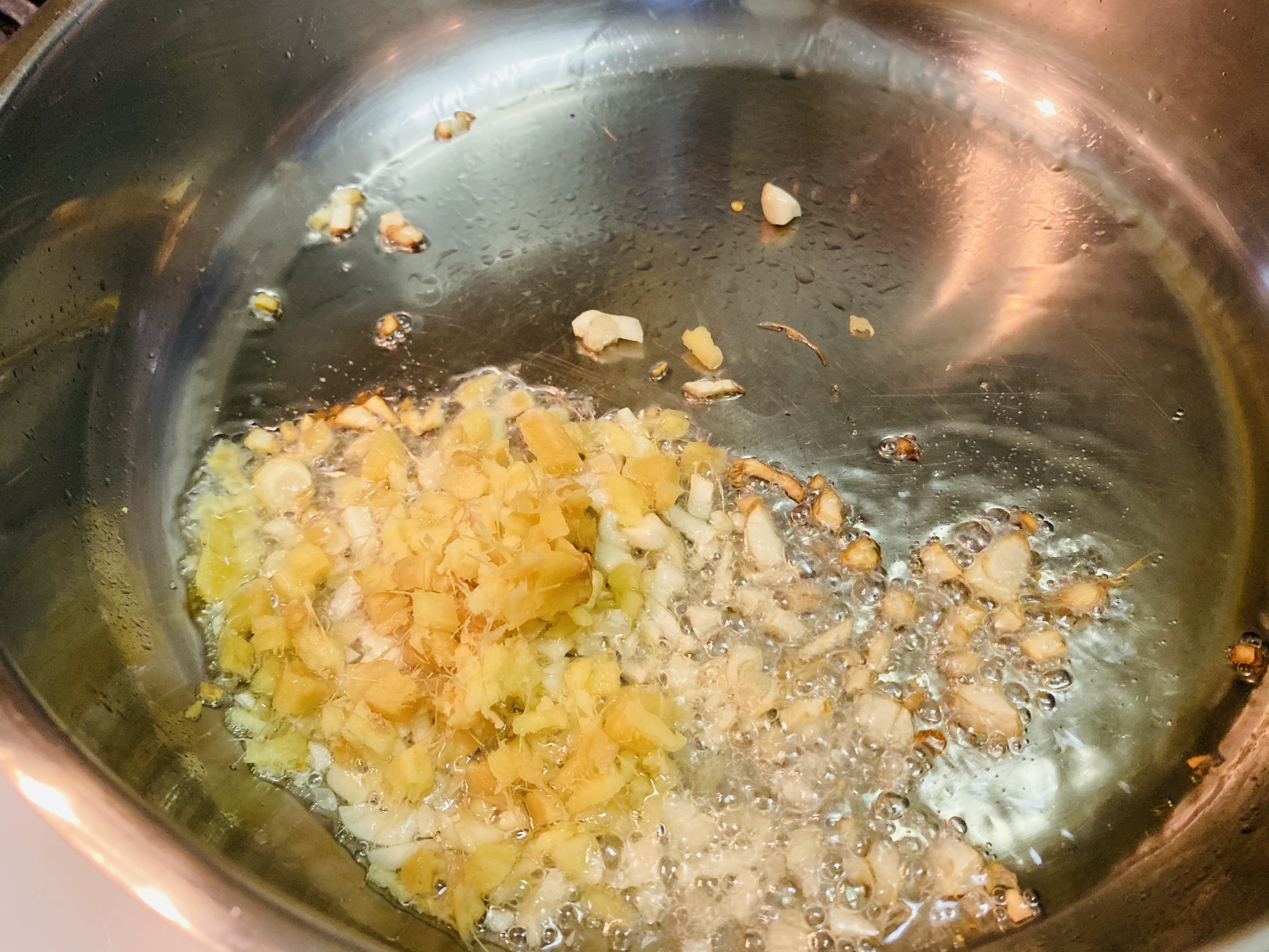 Step6: Drizzle the remaining 1 tablespoons of oil in the wok over medium-high heat. Add the chopped garlic, ginger, and cook them for about 1 minute, stirring constantly. Add green chilly and red chili flakes and cook for another minute. Adding green chili is totally optional.