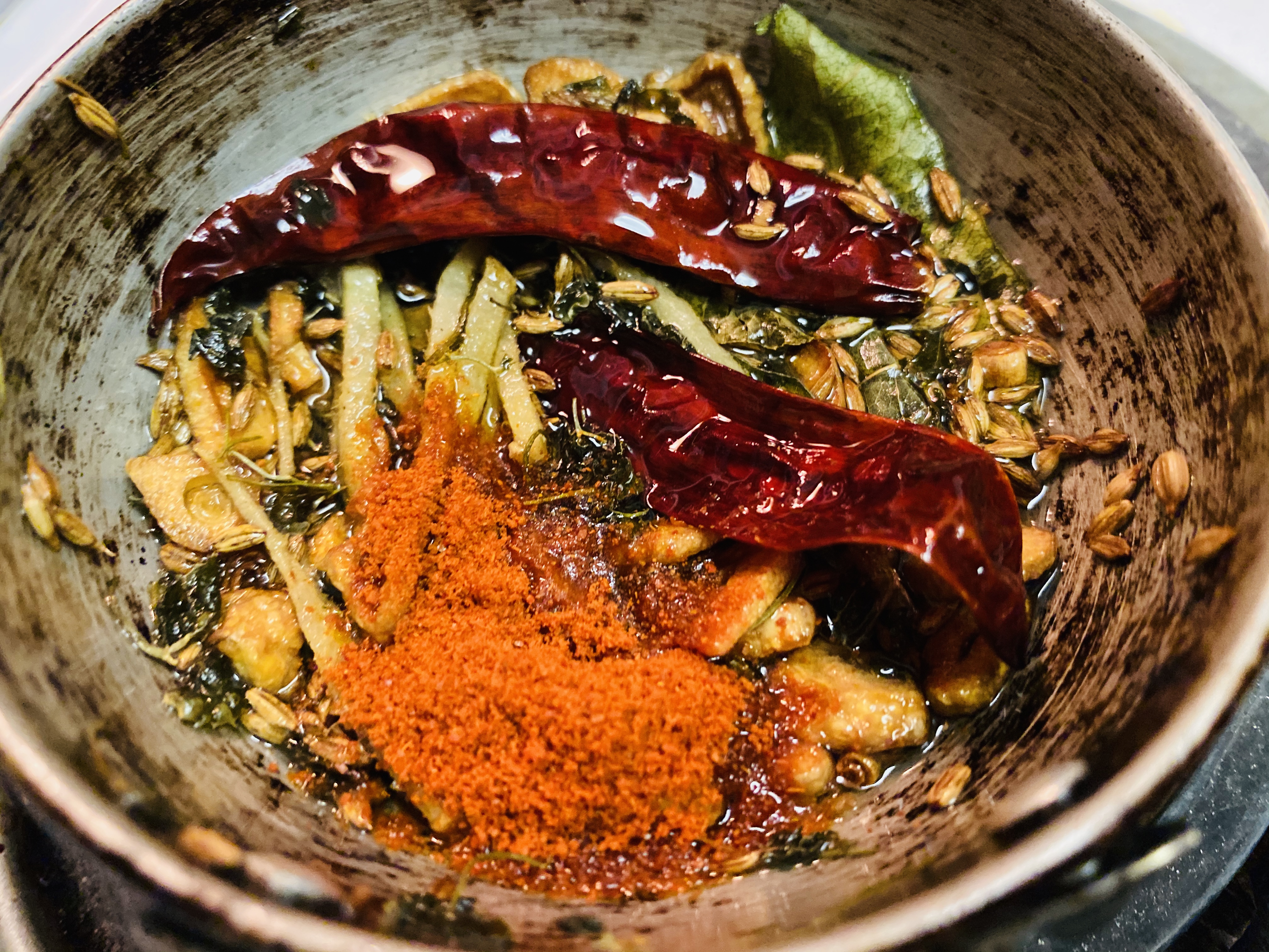 Step12: Turn off the flame and add 1/2 teaspoon red chili powder. Tadka is ready.