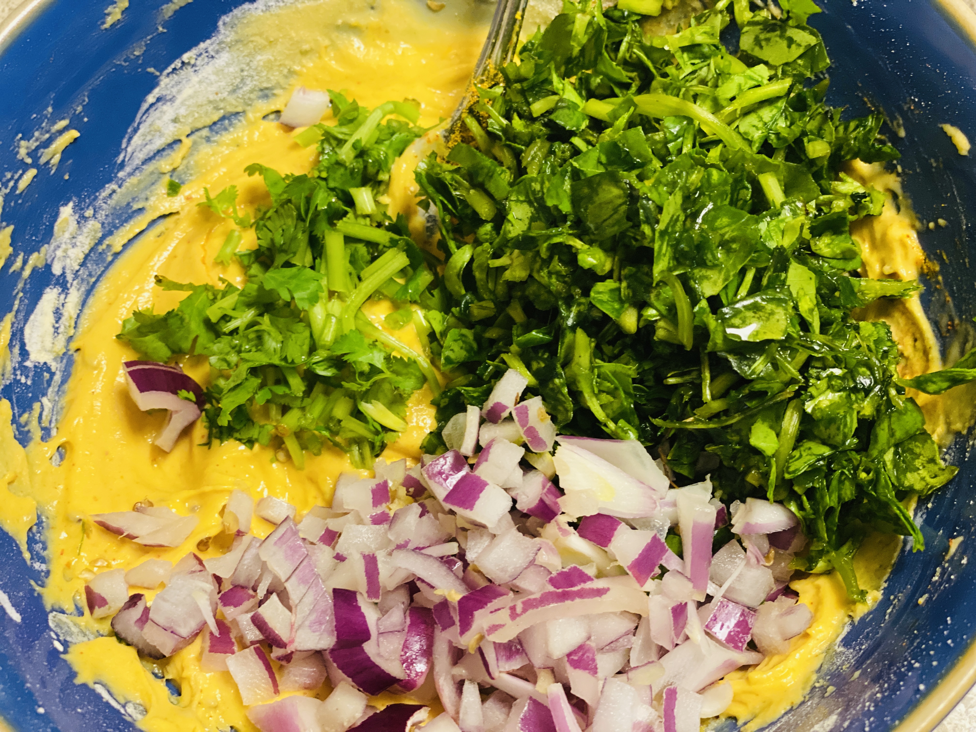 Step3: Now add finely chopped onion, coriander leaves, ginger, chilly, chopped methi leaves and mix everything well. Let the batter rest for 5 minutes. Make sure the batter is thick enough to hold the methi leaves and isn’t too thin or runny. If you feel it’s too thin, add little more flour. Adding onion is optional, you may skip it.